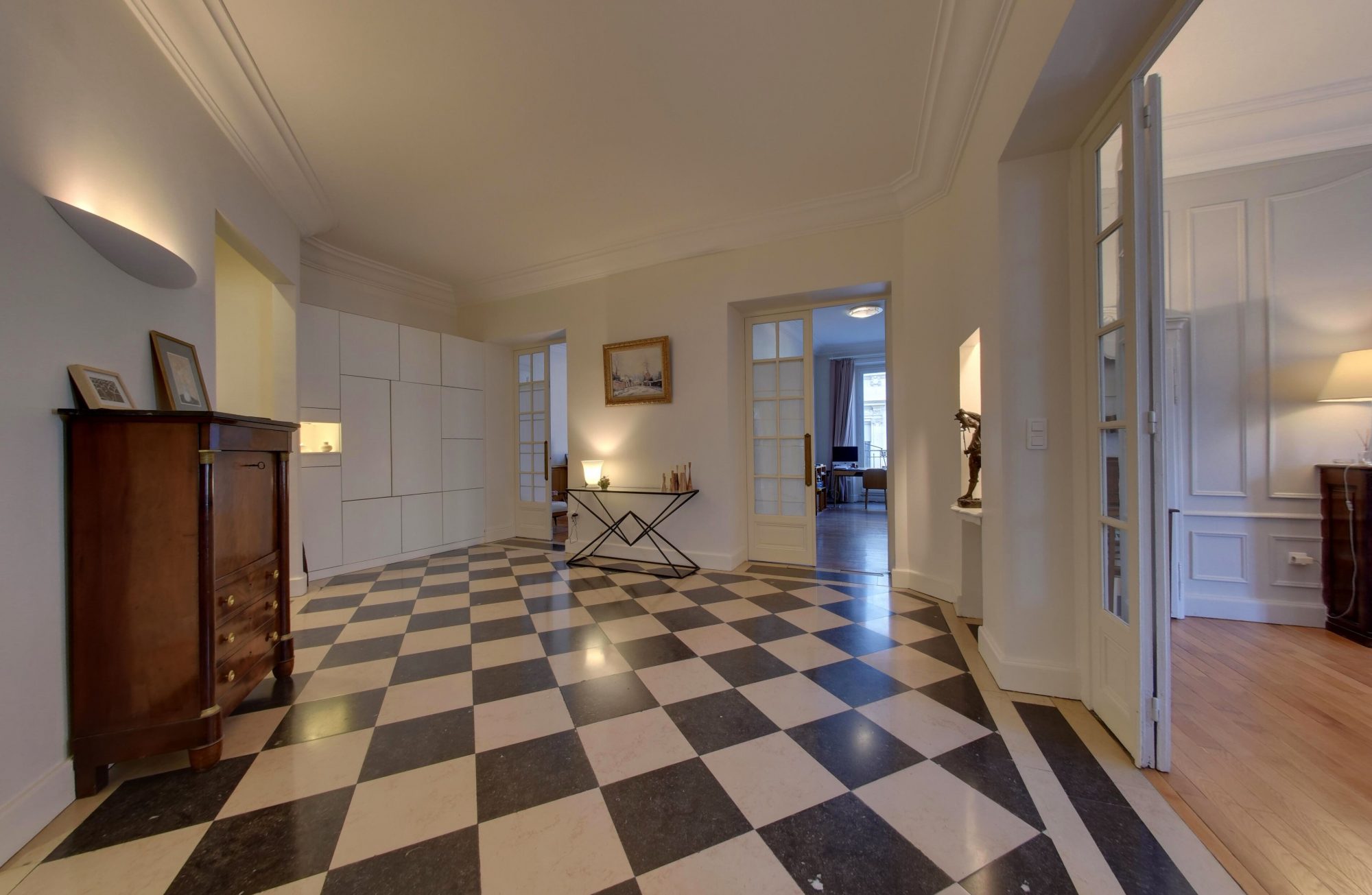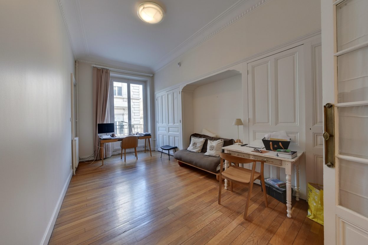 De nombreux codes de l’haussmannien ont été conservés, les moulures en plâtre présentent dans toutes les pièces, les boiseries décoratives, une très belle cheminée, les hauteurs sous plafond…